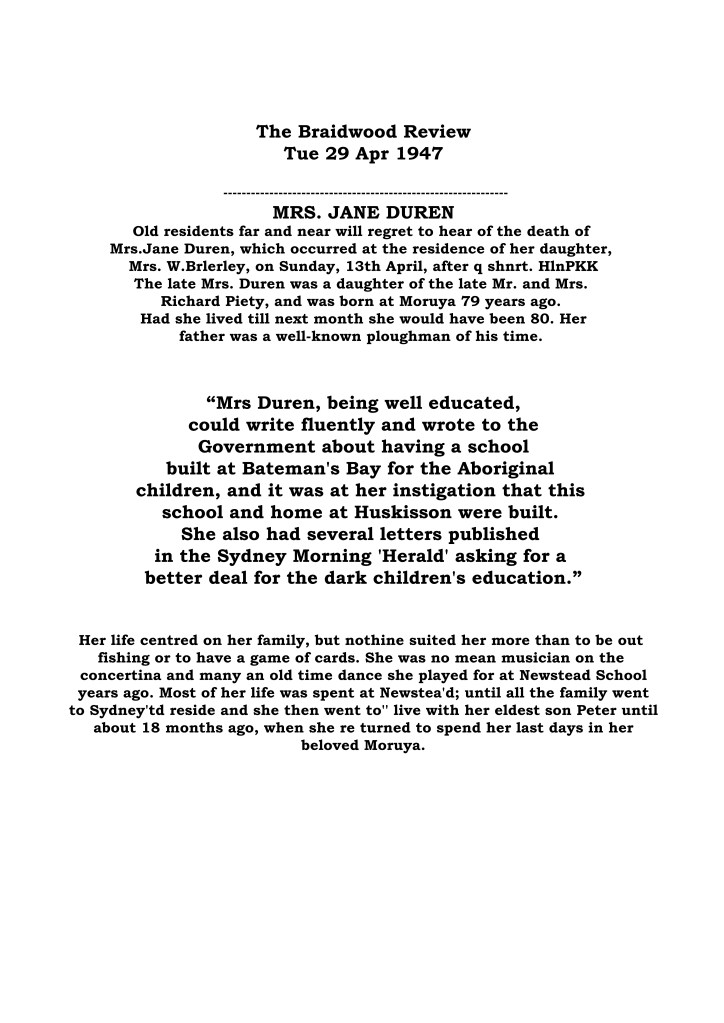 Jane Duren certainly deserves her place amongst prominent early Aboriginal activists and she died in 1947.