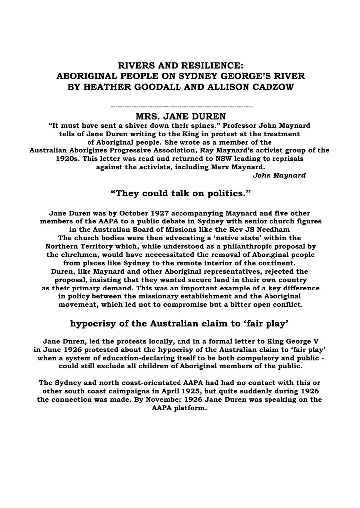 Jane Duren slammed home the inequality of Aboriginal existence through education and the inability of the New South Wales Protection Board to respond to Aboriginal complaint and ill treatment: